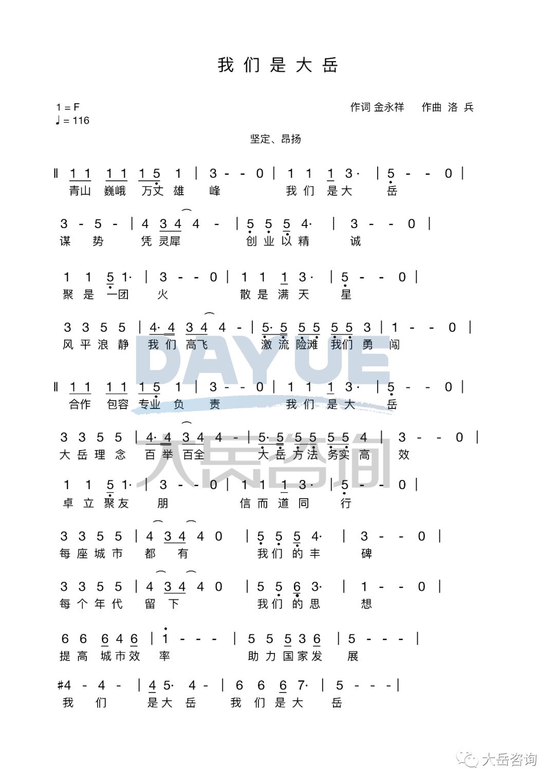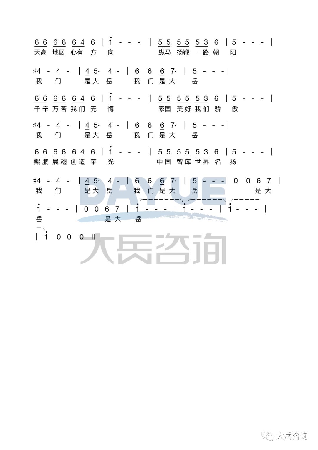 《我們是大嶽》是大嶽谘詢公司的司歌,由董事長金永祥作詞、著名作曲家洛兵作曲,大嶽合唱團演繹,於2018年10月25日在京首發。